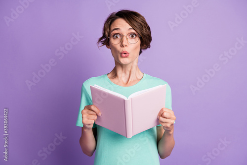 Photo of nice impressed short brown hairdo lady read planner wear spectacles blue t-shirt isolated on violet background