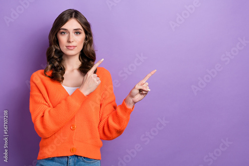 Photo of nice lovely girl indicate fingers empty space useful tips isolated on violet color background