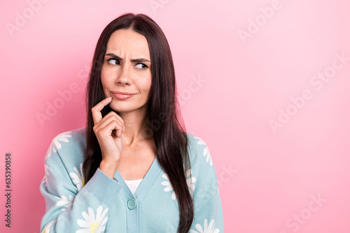 Photo of nice woman with straight hairdo dressed blue cardigan thoughtfully look empty space finger chin isolated on pink color background