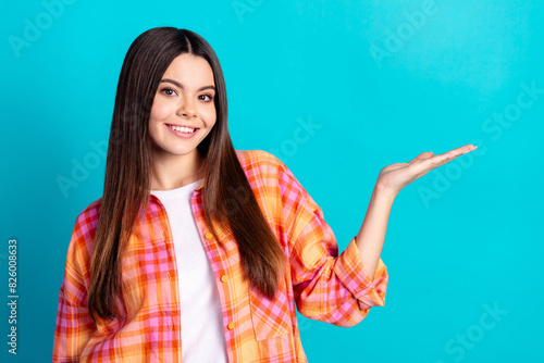 Photo of nice young girl hold empty space wear plaid shirt isolated on teal color background