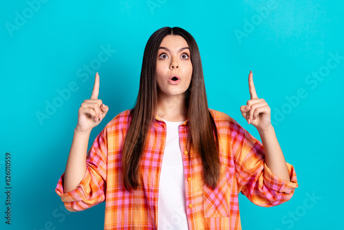 Photo of nice young girl indicate fingers up empty space wear plaid shirt isolated on teal color background