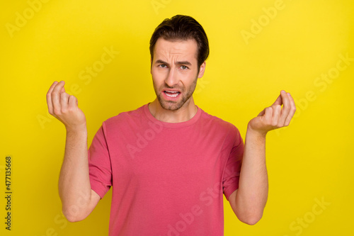 Photo of offended mad client make bad customer service complaint wear pink t-shirt isolated yellow color background