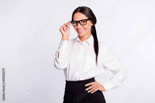 Photo of optimistic brunette hairdo lady stand wear spectacles shirt isolated on grey color background