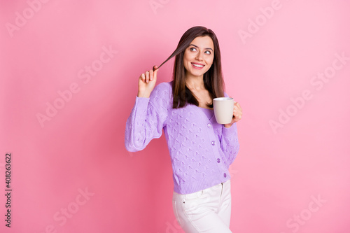 Photo of optimistic girl hold cup look empty space wear lilac sweater trousers isolated on pink color background