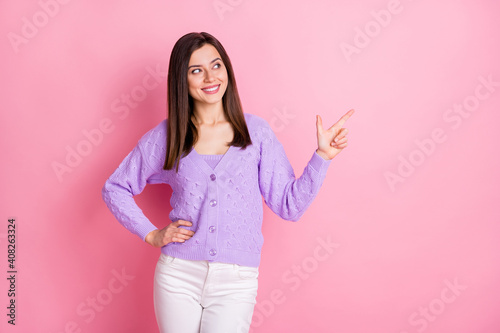 Photo of optimistic girl point look empty space wear lilac sweater trousers isolated on pink color background