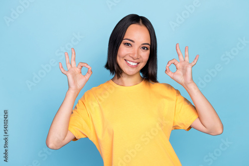 Photo of optimistic gorgeous girl with bob hairstyle wear yellow t-shirt showing okey symbol nice job isolated on blue color background