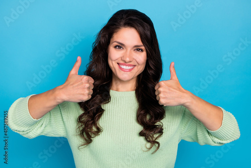 Photo of optimistic mature brunette lady show thumb up wear green sweater isolated on blue color background