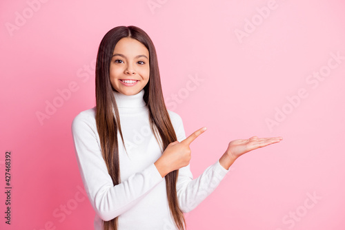Photo of optimistic nice brunette girl point hold empty space wear white sweater isolated on pastel pink color background