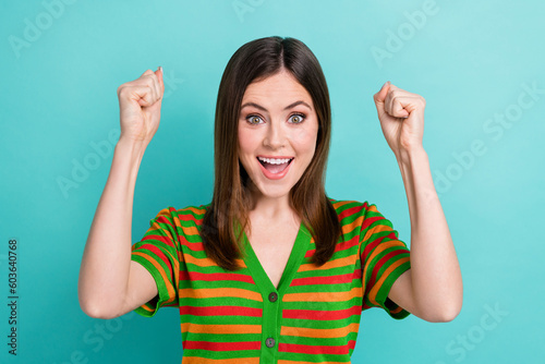 Photo of overjoyed cheerful lady wear stylish clothes raise arms celebrate low prices isolated on cyan color background