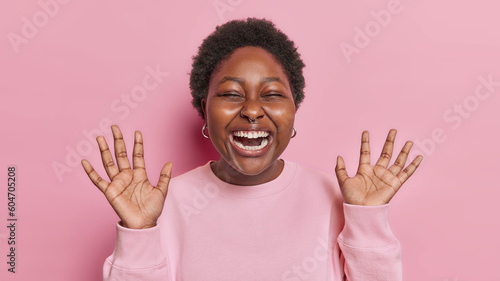 Photo of overjoyed dark skinned woman exclaims loudly and laughs joyfully keeps palms raised up dressed in casual pullover makes excitement gesture isolated over pink background hears surprising news
