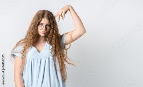 Photo of Pensive girl with curly long hair, and in round spectacles, looking up having pensive expression and holding her hand near head. Isolated over white background. Copy space for your text