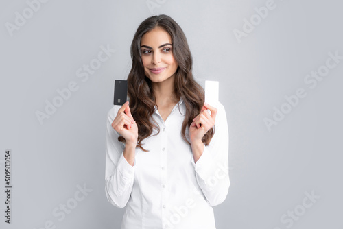 Photo of pleased young woman posing isolated over gray background holding debit credit card.