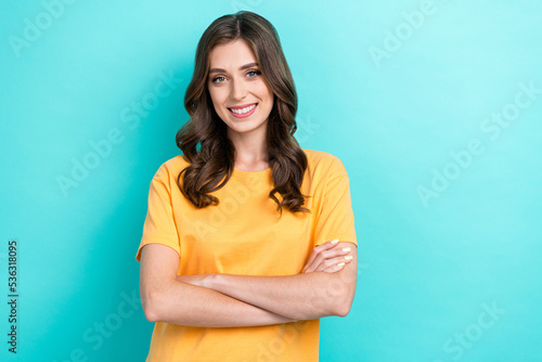Photo of posititve nice lady wear yellow outfit satisfied new haircut recommend salon empty space isolated on cyan color background