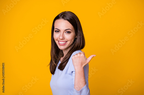 Photo of positive cheerful girl point thumb copyspace present ads promo wear shirt isolated over vivid color background