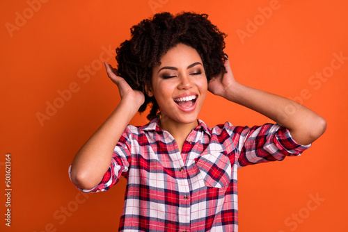 Photo of positive cheerful lady have new haircut enjoy her hair wear plaid outfit isolated vibrant color background