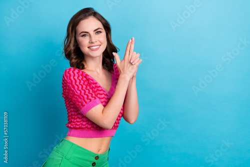 Photo of positive crazy lady guard protecting boss showing pistol sign having fun empty space isolated on blue color background