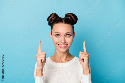 Photo of positive girl indicate forefingers up look empty space wear white sweater isolated blue color background