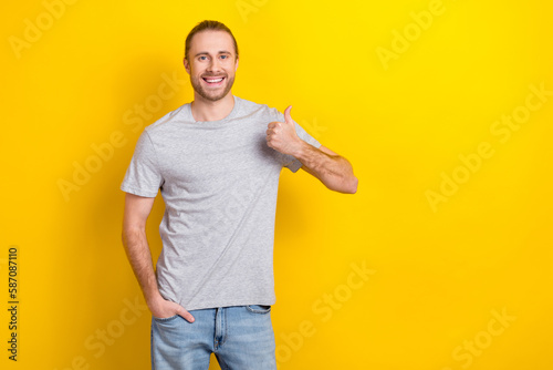 Photo of positive good looking man wear stylish clothes thumb up promoting quality product empty space isolated on yellow color background