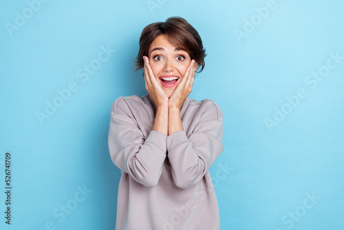 Photo of positive impressed lady toothy smile arm touch cheekbones face dont believe rejoice win isolated on blue color background
