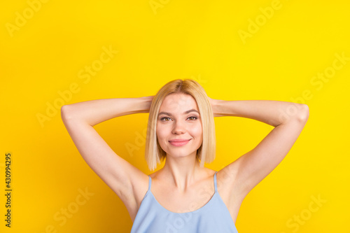 Photo of positive nice blond short hair lady rest wear blue top isolated on vivid yellow color background