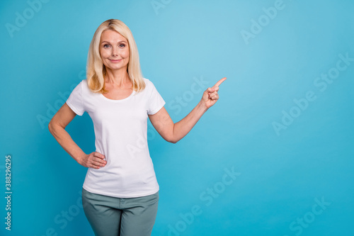Photo of positive old lady point index finger copyspace wear good look outfit isolated over blue color background