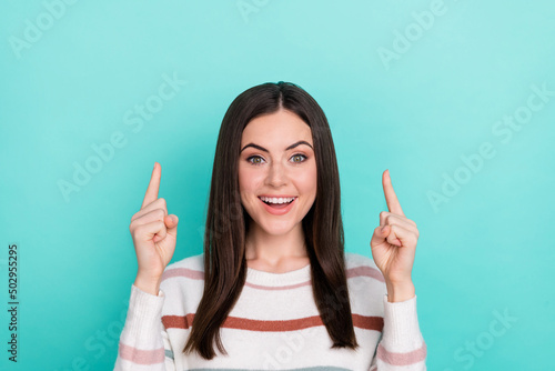 Photo of positive promoter lovely lady direct finger empty space wear striped pullover isolated blue color background