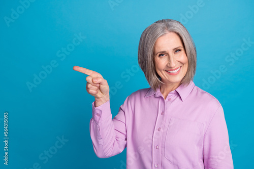Photo of positive satisfied businesswoman bob grey hair indicate finger empty space indicate good news promo isolated on blue color background