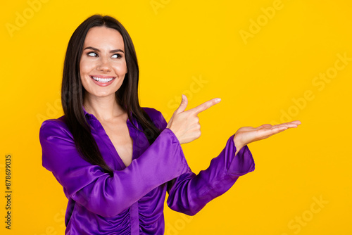 Photo of positive smiling lady promoter hold hand look pointing empty space isolated yellow color background
