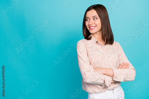 Photo of pretty adorable lady wear trendy outfit interested look empty space discount offer proposition isolated on cyan color background