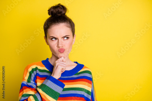 Photo of pretty bun hairstyle person arm on chin look empty space decision wear pullover isolated on yellow color background