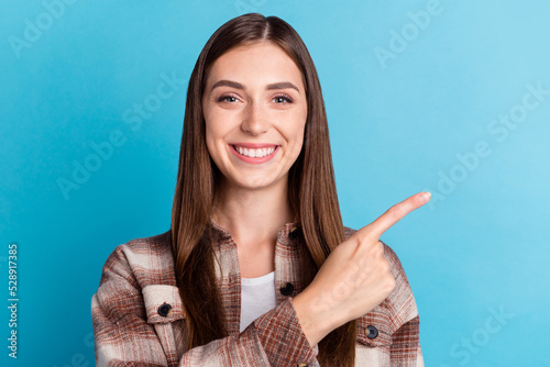 Photo of pretty charming lady toothy smile direct finger empty space blank isolated on blue color background