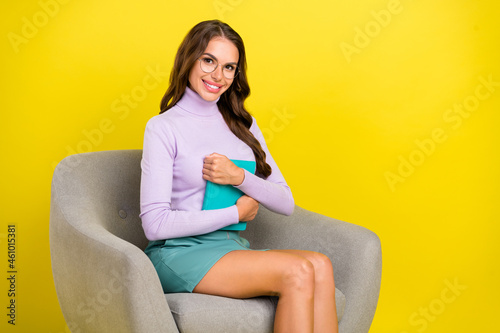 Photo of pretty cheerful person hands hold book beaming smile look camera isolated on yellow color background