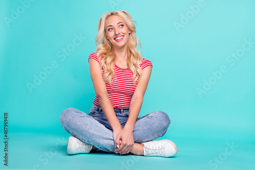Photo of pretty dreamy young woman dressed red t-shirt smiling sitting floor looking empty space isolated teal color background
