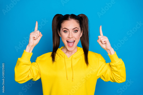 Photo of pretty funny lady two tails hairdo raise both arms direct fingers up empty space sale shopping banner wear casual yellow hoodie pullover isolated bright blue color background