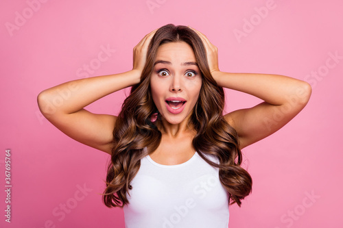 Photo of pretty funny wavy lady crazy facial expression open mouth arms on head listen cool news successful person wear white casual singlet isolated pink color background