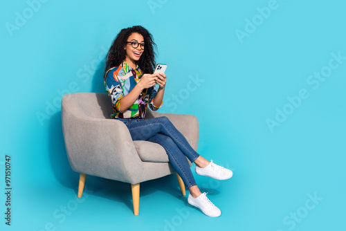 Photo of pretty lovely cheerful woman wear trendy clothes sit armchair read news isolated on blue color background