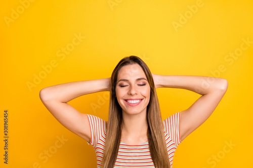 Photo of pretty positive lady resting first summer weekend lying beach eyes closed dreamy mood hands behind head wear casual striped t-shirt isolated yellow color background