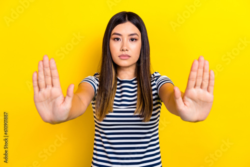 Photo of pretty serious lady wear striped dress showing arms palms asking stop isolated yellow color background