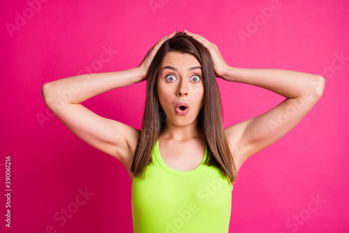 Photo of pretty surprised young lady open mouth hands head wear lime top isolated vibrant pink color background