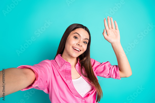 Photo of pretty teen girl take selfie photo wave hand hi wear trendy pink outfit isolated on aquamarine color background