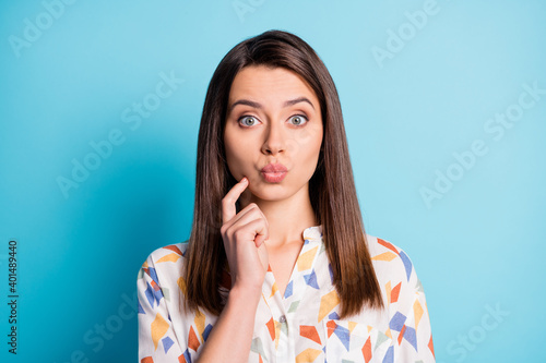 Photo of pretty young girl finger cheek look camera space funny face lips wear geometry print shirt isolated blue color background