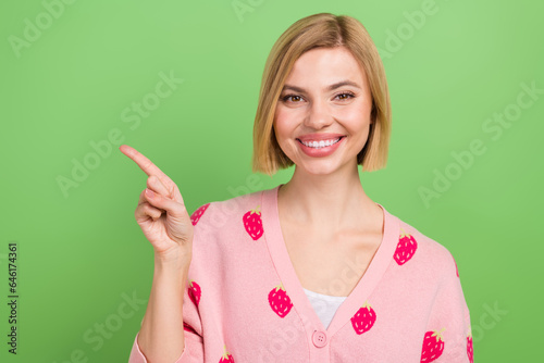 Photo of pretty young girl finger point empty space dressed stylish pink strawberry print outfit isolated on green color background
