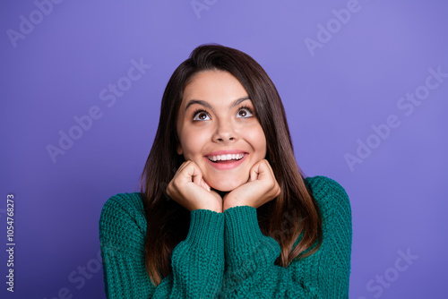 Photo of pretty young girl look up empty space wear pullover isolated on purple color background