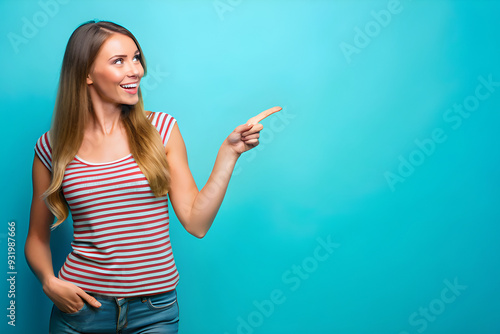 Photo of pretty young woman direct fingers empty space wear isolated on blue color background