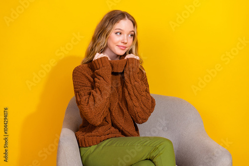 Photo of pretty young woman sit chair look empty space wear pullover isolated on yellow color background