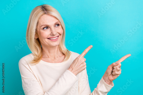 Photo of retired business woman trendy white shirt direct fingers look mockup new proposition jobs offers isolated on aquamarine color background