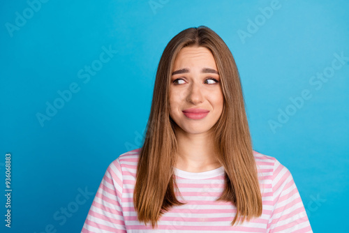Photo of sad upset cute woman wear stylish pink clothes look empty space isolated on blue color background