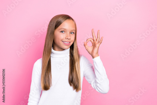 Photo of satisfied girl wear stylish sweater hand demonstrate positive feedback okey symbol empty space isolated on pink color background