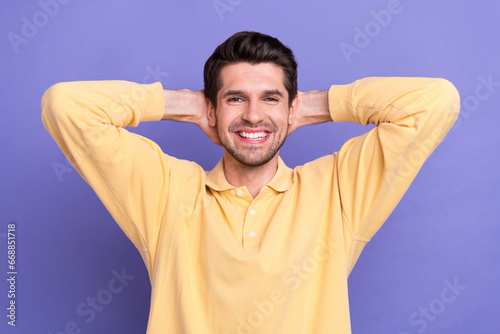 Photo of satisfied glad person beaming smile arms behind head have good mood isolated on violet color background