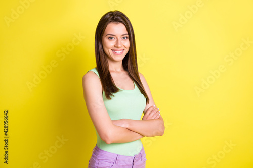 Photo of self-assured pretty lady folded hands toothy beaming smile wear green singlet isolated yellow color background